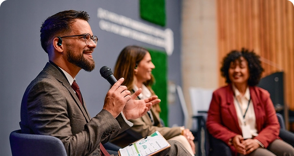 Transmettez votre message avec assurance et impact, quel que soit votre public. Événements professionnels, sommets, ateliers, séminaires, présentations : Vasco Audience traduit instantanément plusieurs langues simultanément, permettant à chaque participant de suivre, réagir et interagir en temps réel.